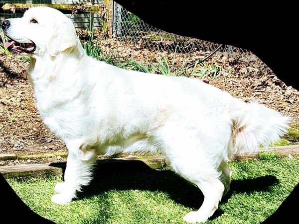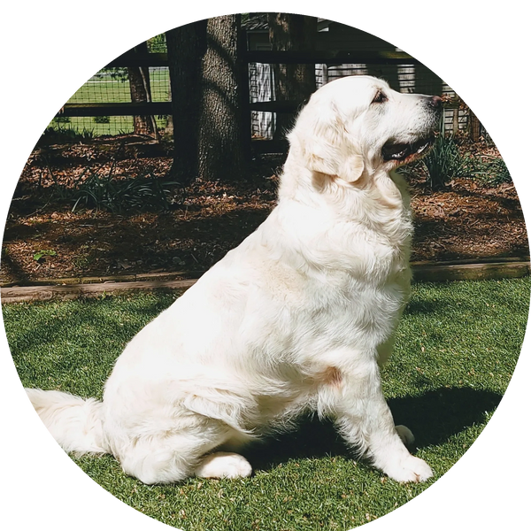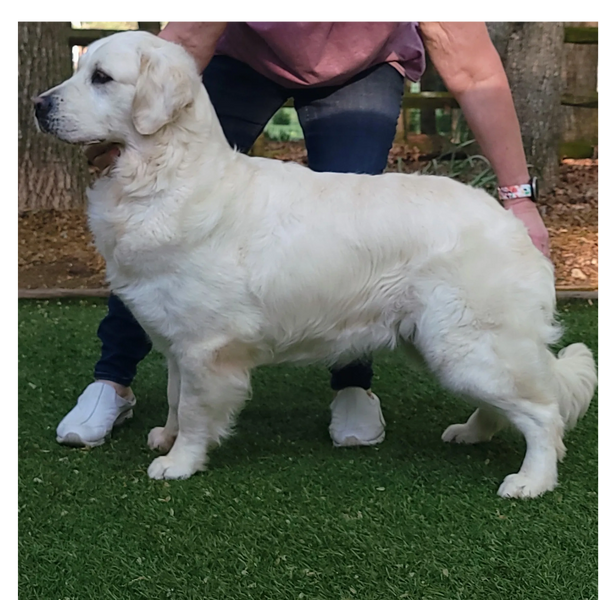 She has a stunning blocky head, beautiful black pigment, gorgeous body structure and glides as she moves. She was born via a frozen semen breeding of her dad Reuben. Reuben was a dog we imported from the Netherlands from the top breeder in the country. His mom was the top Golden Retriever in the show ring before she took a maternity break to have the litter that produced Reuben. He arrived at 8 weeks of age and was everything that we had hoped for! He was such a sweet, happy dog. We always said “Reuben’s never had a bad day” and had so many adorable things that he would do. He had jet black pigment even as an old dog which contrasted to his cream color. He had a big solid body and acted and looked like a 2 year old dog into old age.